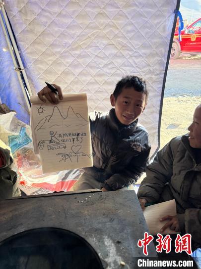 多吉擔心地震給孩子們帶來心理陰影,為了讓他們樂觀度過這段時間,多吉整理了單位用來存放物資的帳篷作為畫畫的地方,又特意托加油站工作人員為孩子們購買了彩筆和畫本。