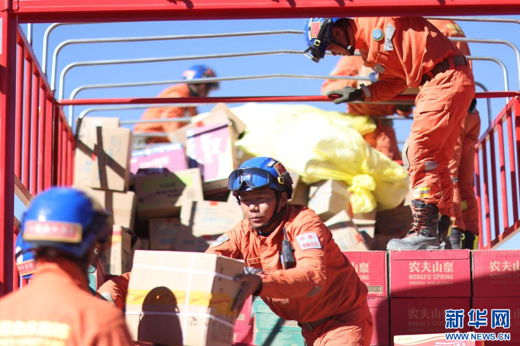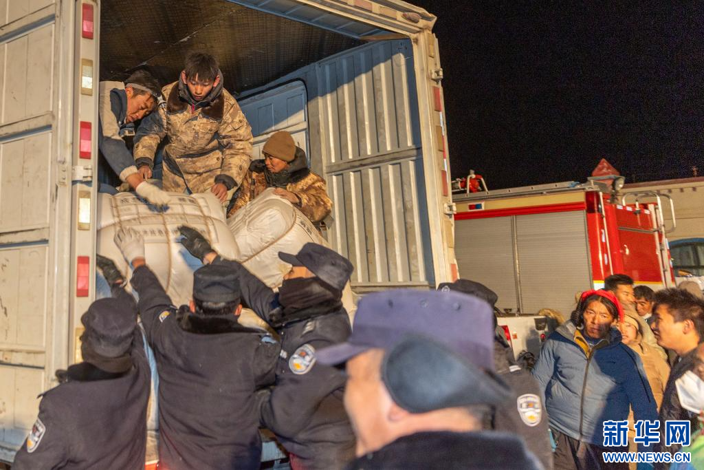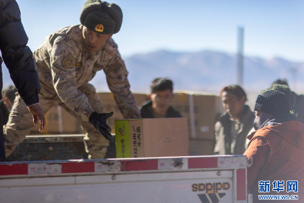 1月9日,救援人員在拉孜縣拉孜鎮(zhèn)措布村卸載救災(zāi)物資。新華社記者 姜帆 攝