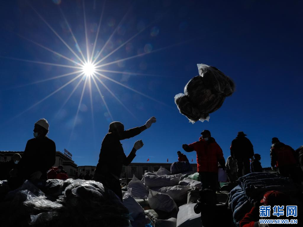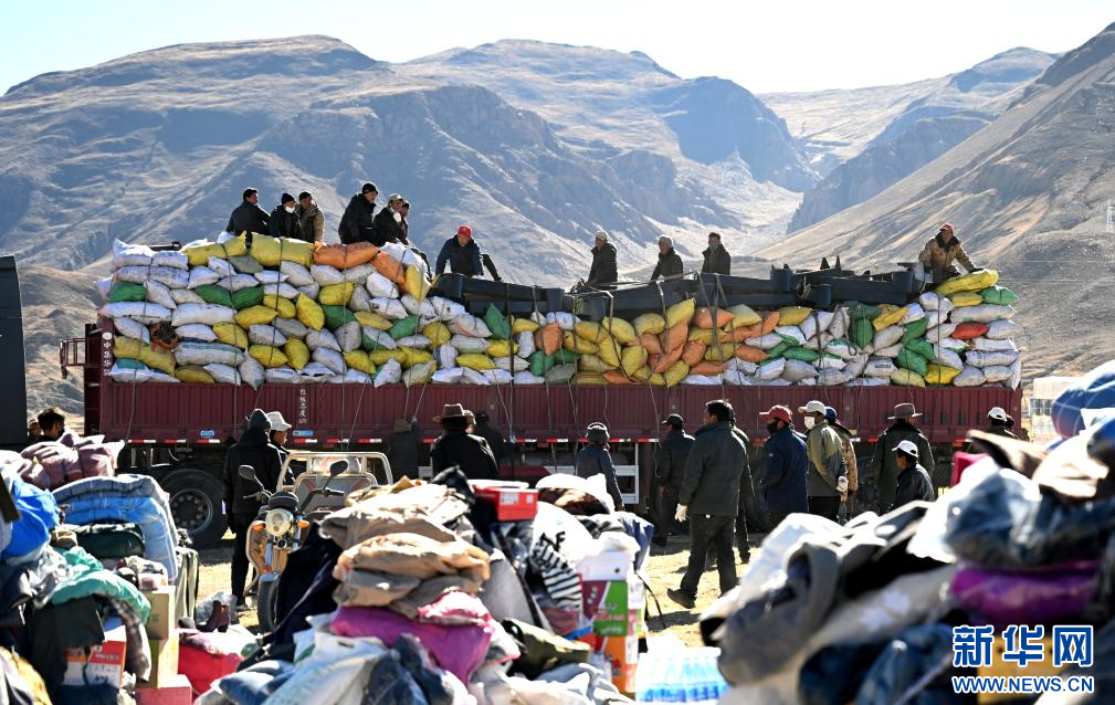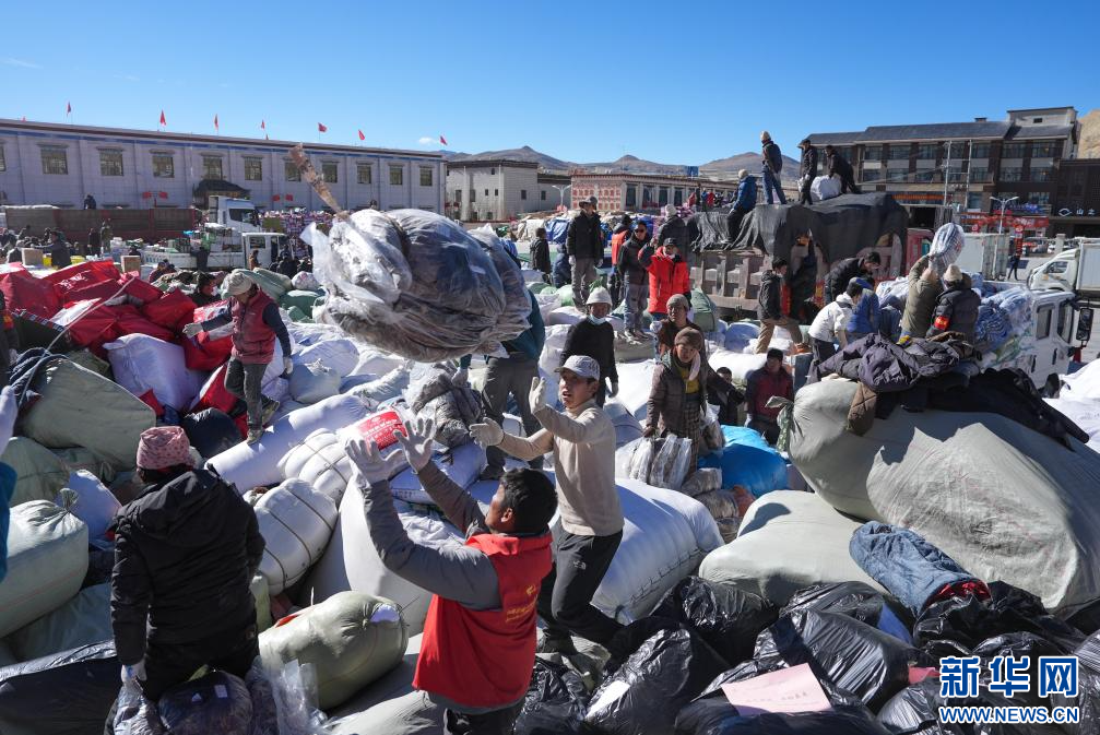 1月10日,在定日縣民族團(tuán)結(jié)廣場,人們搬運將要運往受災(zāi)群眾安置點的過冬物資。新華社記者 沈伯韓 攝