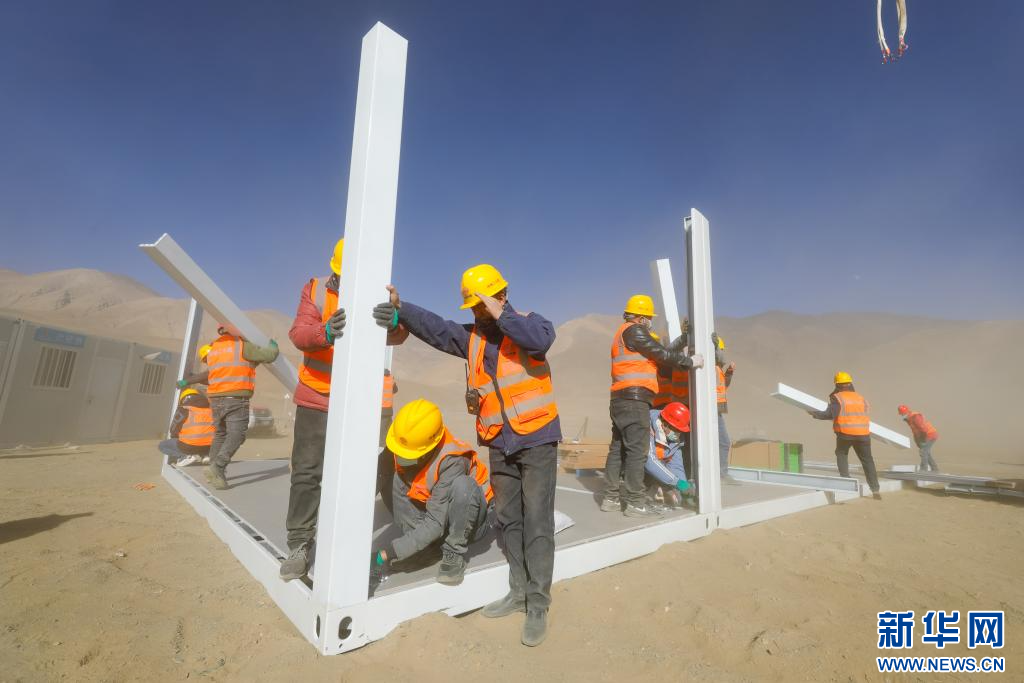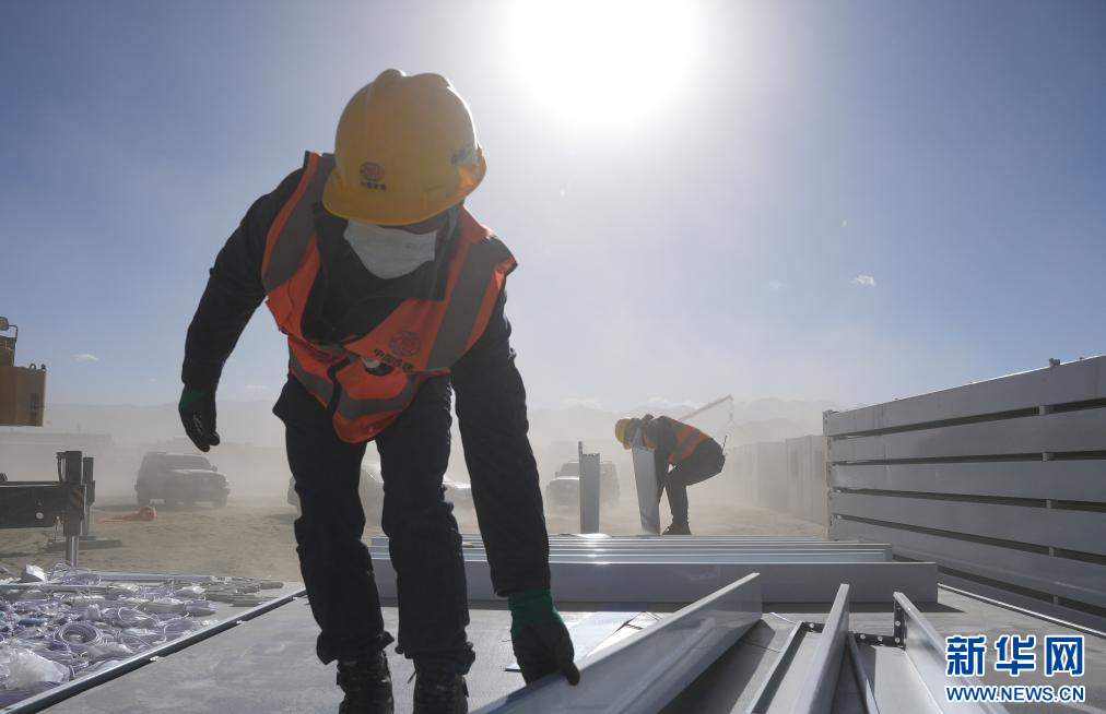 1月9日,中鐵二十局施工人員頂著風(fēng)沙在長所鄉(xiāng)森嘎村安裝活動板房 。新華社記者 晉美多吉 攝