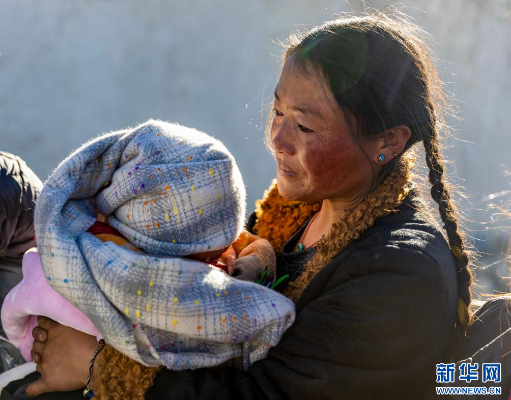 1月7日,兩位抱著孩子的受災(zāi)群眾在拉孜縣曲下鎮(zhèn)土林村的應(yīng)急帳篷里取暖。新華社記者 姜帆 攝