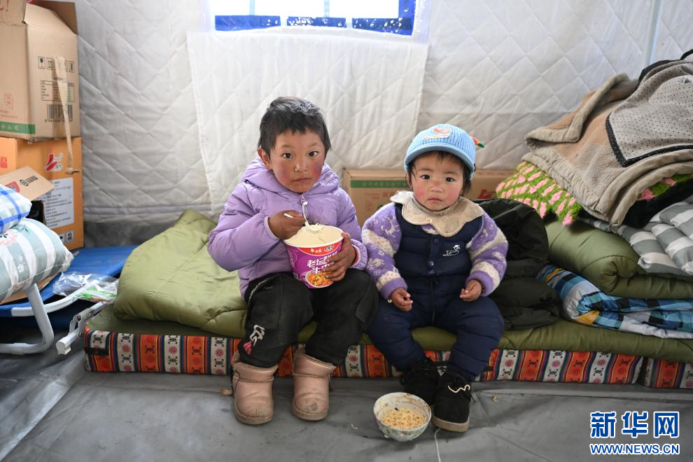 1月9日,拉孜縣芒普鄉(xiāng)一處安置點內(nèi),小朋友在溫暖的帳篷里吃泡面。新華社記者 李響 攝
