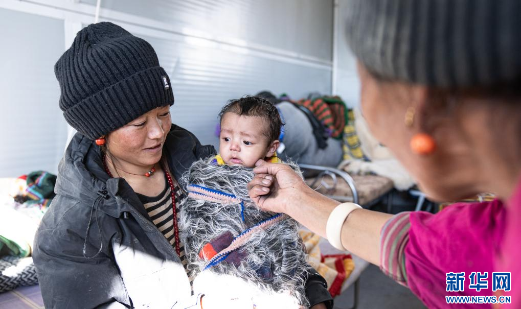 1月8日,定日縣長所鄉(xiāng)通來村的受災(zāi)群眾措姆抱著自己的孩子在領(lǐng)取志愿者送來的御寒衣物。新華社記者 姜帆 攝