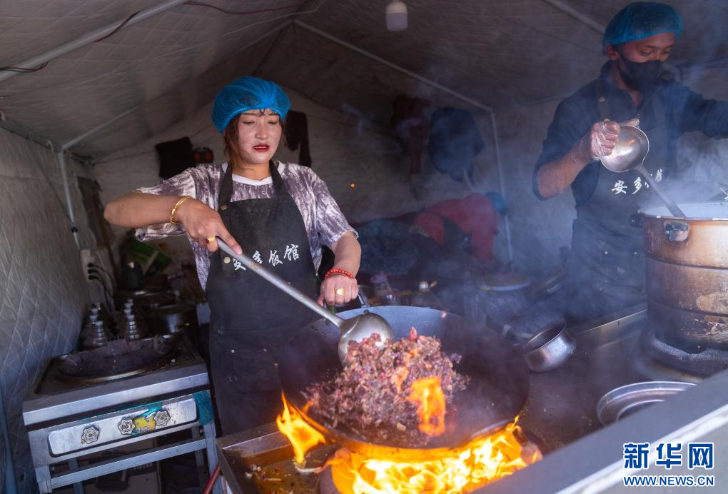 在定日縣長所鄉(xiāng)古榮村,定日縣安多飯館的吉瓊在為安置點的群眾做晚飯(1月15日攝)。新華社記者 丁增尼達(dá) 攝