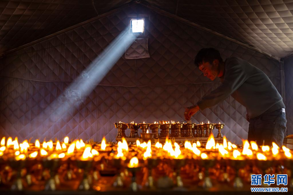 1月12日,在定日縣長所鄉(xiāng)古榮村,一名受災(zāi)村民為在定日縣6.8級地震中逝世的親人點長明燈祈福。新華社記者 沈伯韓 攝