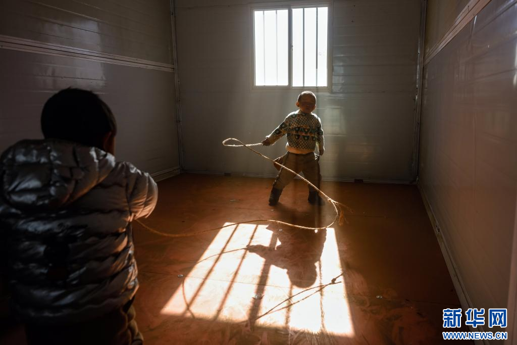 1月10日,在定日縣長所鄉(xiāng)古榮村,兩名小朋友在搬入的板房內(nèi)玩耍。新華社記者 沈伯韓 攝