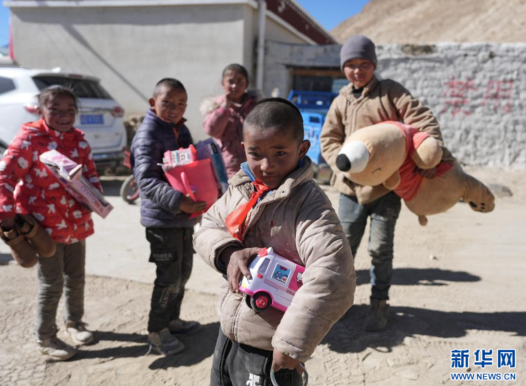 1月11日,災(zāi)區(qū)的孩子們領(lǐng)到了愛心人士捐贈的玩具。新華社記者 晉美多吉 攝