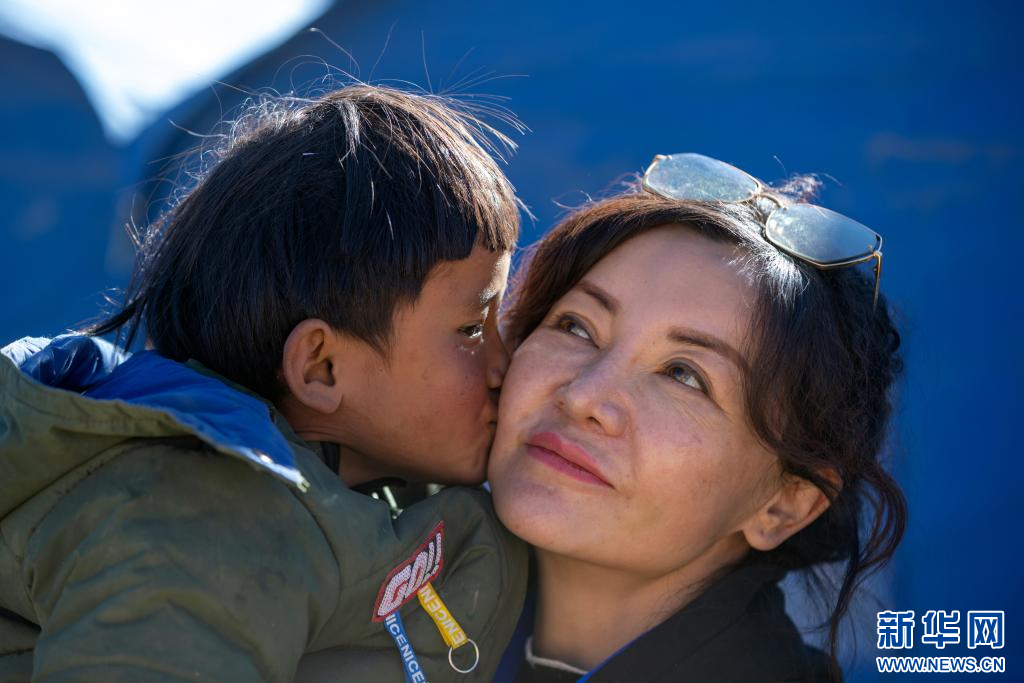 1月11日,在定日縣曲洛鄉(xiāng)措昂村的受災(zāi)群眾安置點,一名藏族女孩親吻中國科學(xué)院心理研究所應(yīng)急心理救援隊的專家譚惜仁(右)。新華社記者 沈伯韓 攝