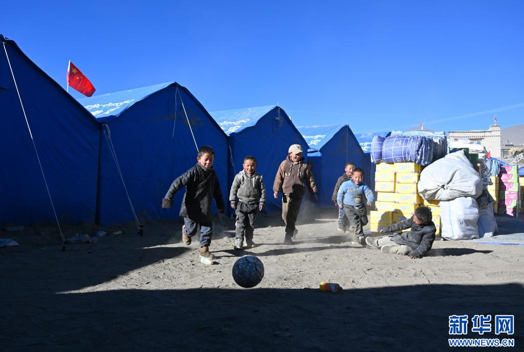 1月11日,薩迦縣麻布加鄉(xiāng)普村安置點的小朋友在踢球。新華社記者 李響 攝