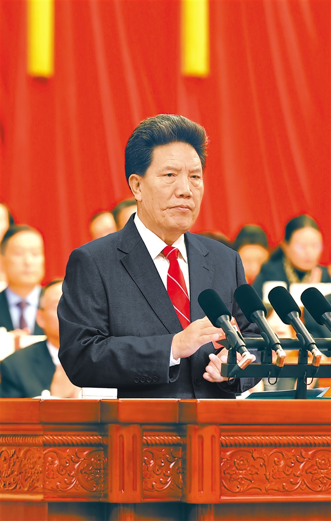 全國人大常委會副委員長、自治區(qū)人大常委會主任洛桑江村向大會作自治區(qū)人大常委會工作報(bào)告。記者 次仁平措 攝