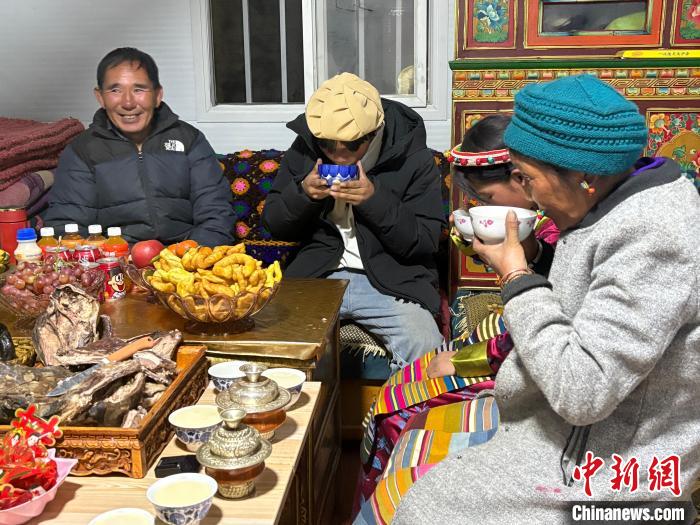 圖為日喀則市拉孜縣錫欽鄉(xiāng)錫欽村安置板房?jī)?nèi),吳子周一家人在喝大年初一的“羌鍋”。何金龍 攝