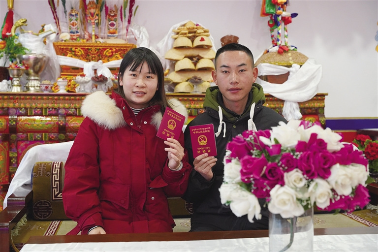 “我們在一起3年了,是表姐牽的紅線?!钡┰龈峦吣樕涎笠缰腋5男θ荩従徴f道,“初次見到卓嘎,我就對她心生好感。相處一段時間后,我發(fā)現(xiàn)她性格溫柔,和我特別合拍,于是鼓起勇氣向她表白?!彼_心地展示著剛剛領(lǐng)到的結(jié)婚證,“情人節(jié)是個好日子,我們早就計劃好今天領(lǐng)證,現(xiàn)在終于如愿以償。以后情人節(jié)和結(jié)婚紀念日合二為一,既能少買一份禮物,也不用擔心忘記啦?!?/p>