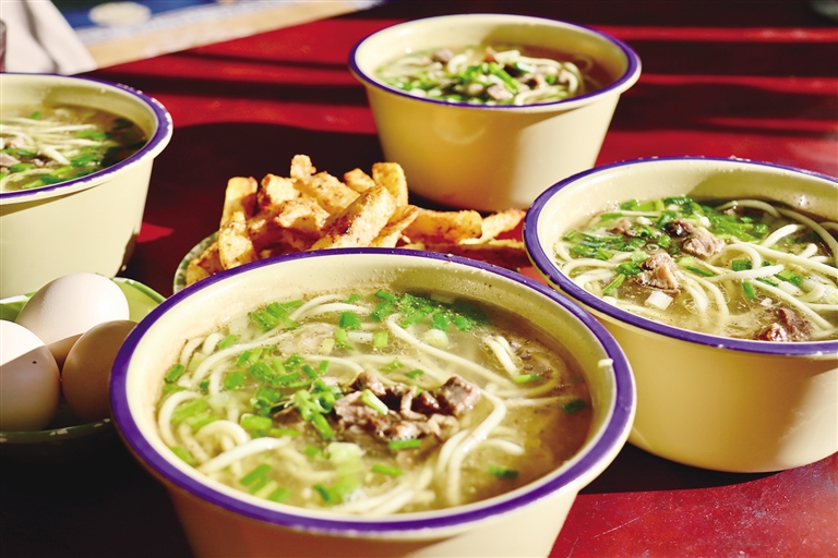 在西藏,人們總能將簡單的食材做出獨一無二的“西藏味道”。一壺甜茶,一碗藏面,一份炸土豆或肉餅,便是這里最標準的早餐套餐。清水、紅茶茶葉、甜奶粉或牦牛奶,只需簡單的食材,便能制作出茶香濃郁、奶味醇厚的甜茶。在略帶寒意的初春,喝上一口,整個身子都暖了起來。此時搭配一碗筋道的藏面,簡單又滿足。