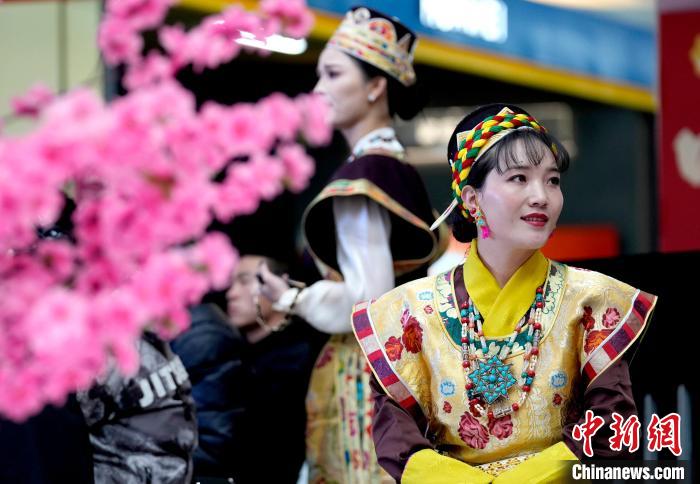 圖為西藏林芝第二十二屆桃花旅游文化節(jié)推介會(拉薩站)現場,身著藏裝的工作人員。李林 攝