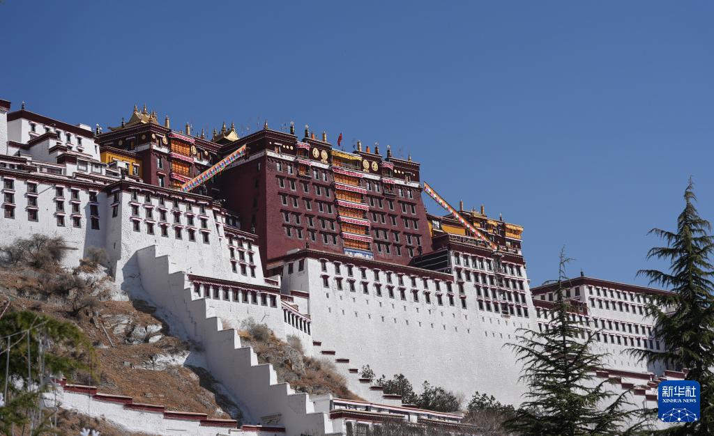 2月28日,游客在拉薩布達拉宮前合影留念。