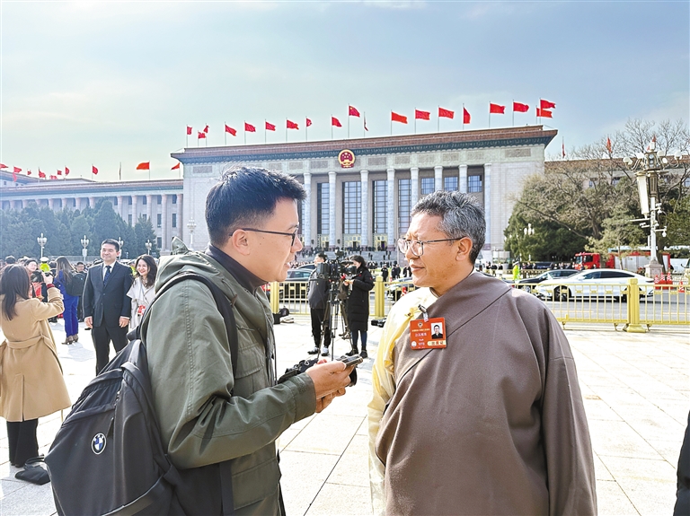 圖為住藏全國政協(xié)委員邊巴拉姆(右)接受媒體記者采訪。記者 丹增平措 攝
