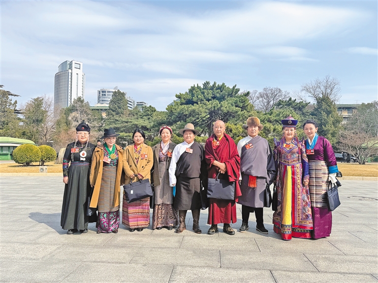 圖為住藏全國政協(xié)委員身著盛裝、滿懷豪情,在人民大會堂前合影留念。記者 丹增平措 攝
