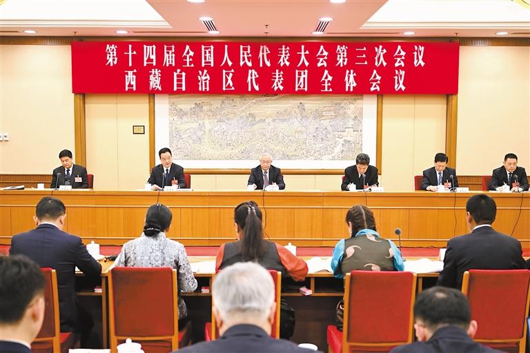 3月5日下午,十四屆全國人大三次會議西藏代表團(tuán)舉行全體會議,審議政府工作報告。