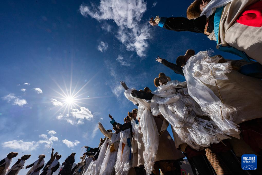 3月16日,在拉薩市林周縣春堆鄉(xiāng)春耕典禮現(xiàn)場,農(nóng)機駕駛員向天空撒糌粑祈愿豐收。新華社記者 晉美多吉 攝