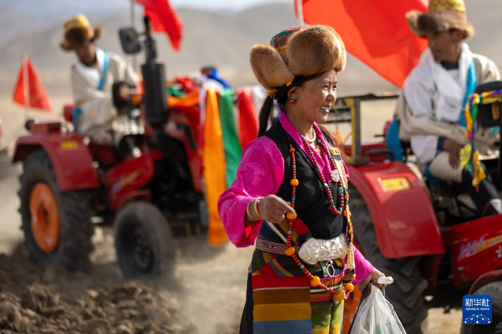 儀式現(xiàn)場(chǎng),38臺(tái)農(nóng)用拖拉機(jī)整齊停放。11時(shí)許,在眾人的祈福聲中,清一色身著白色氆氌藏裝、頭戴長(zhǎng)壽金絲帽的拖拉機(jī)手把拖拉機(jī)開進(jìn)農(nóng)田,機(jī)身后掛的銀色犁頭刨開沉睡了一整個(gè)寒冬的沃土,盛裝的婦女們緊隨拖拉機(jī),播撒希望的種子。