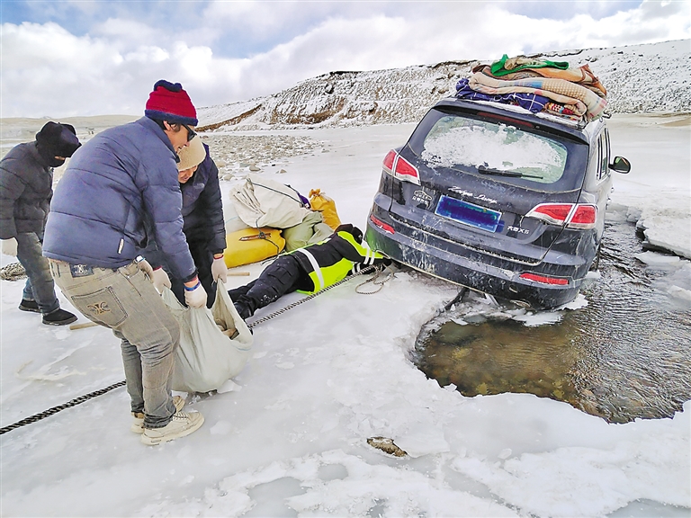 2月16日,聶榮縣公安局桑榮鄉(xiāng)派出所接到轄區(qū)群眾報警求助,稱其在前往冬季牧場途中,車輛不慎陷入結冰河道,無法自行脫困。接警后,派出所立即組織警力攜帶救援工具第一時間趕到現場,只見,被困車輛右側輪胎陷入冰層,動彈不得。對此,民(輔)警迅速采取救援措施,冒著嚴寒使用鐵鍬鑿開并清理輪胎周圍冰層,俯臥在冰面上,為車輛綁上拖車繩,采取車拉人推等方式,全力幫助車輛脫困。最終,經過五個多小時的不懈努力,成功將被困車輛拖拽至安全地帶。