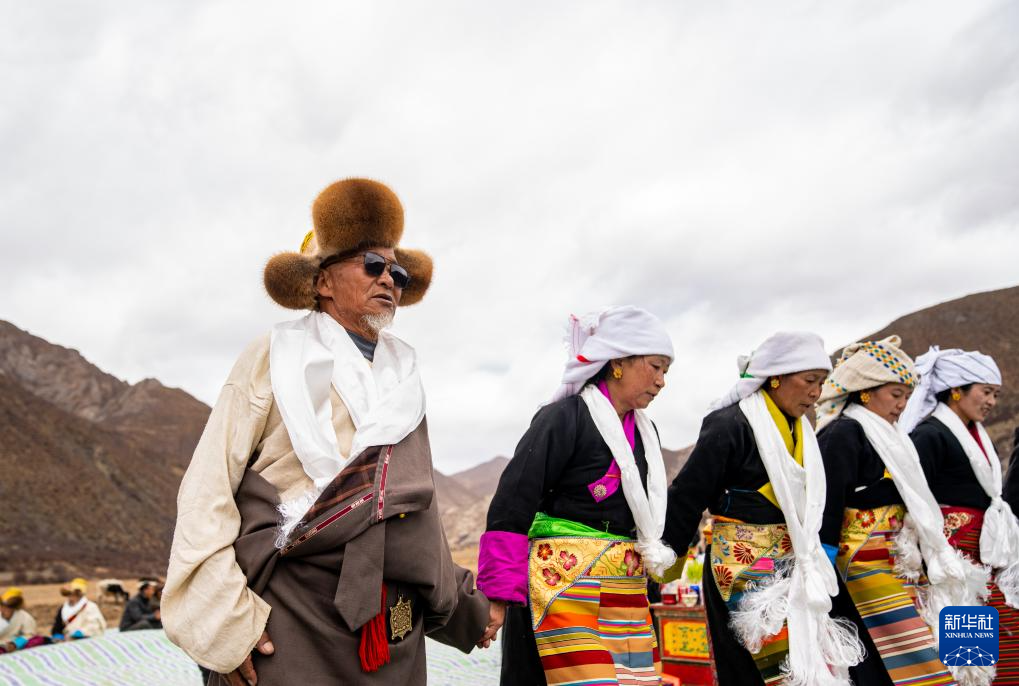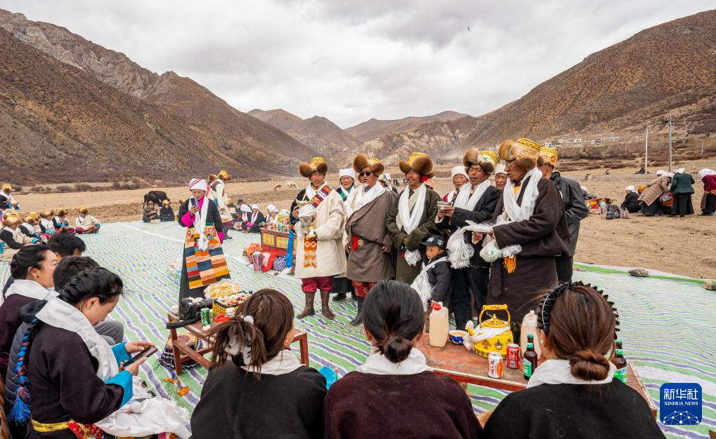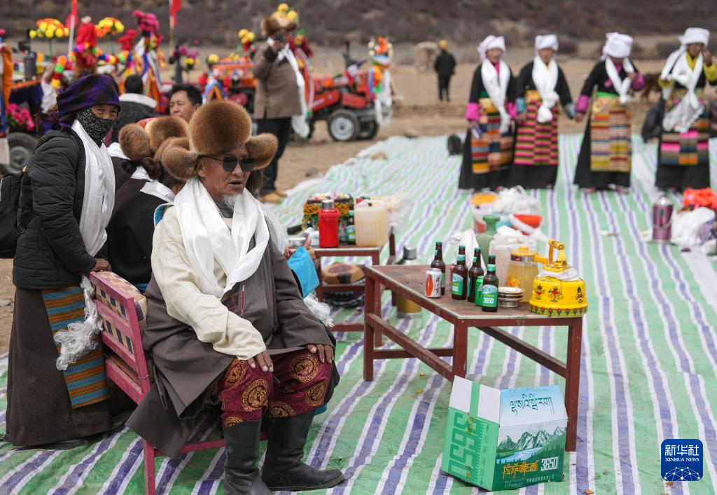 旺慶老人(前排帶墨鏡者)在春耕大典上為客人敬酒獻(xiàn)唱(3月16日攝)。新華社記者 丁增尼達(dá) 攝