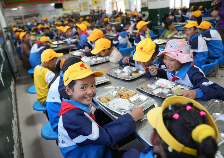 西藏林芝市工布江達縣娘蒲鄉(xiāng)中心小學學生在食堂用餐(2024年9月3日攝)。新華社記者 晉美多吉 攝