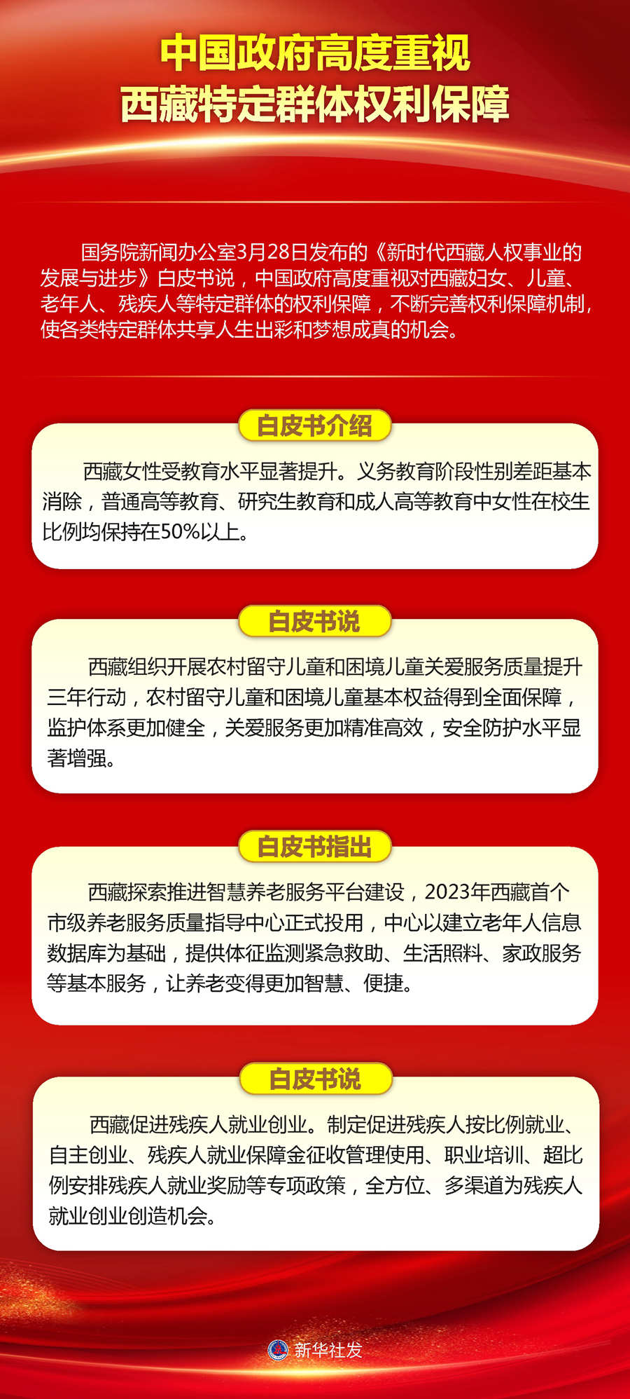 國(guó)務(wù)院新聞辦公室28日發(fā)布的《新時(shí)代西藏人權(quán)事業(yè)的發(fā)展與進(jìn)步》白皮書說,中國(guó)政府高度重視對(duì)西藏婦女、兒童、老年人、殘疾人等特定群體的權(quán)利保障,不斷完善權(quán)利保障機(jī)制,使各類特定群體共享人生出彩和夢(mèng)想成真的機(jī)會(huì)。