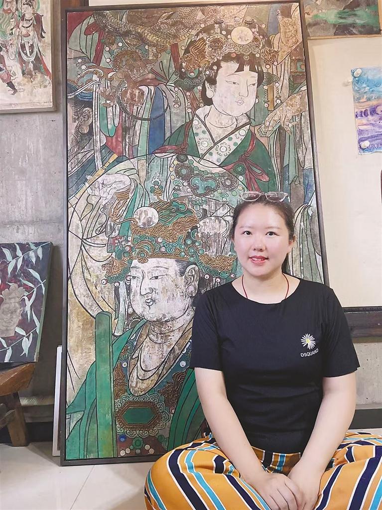 圖為劉曉彤展示她臨摹的壁畫(huà)作品。