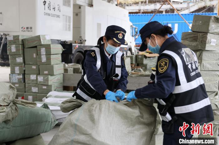 圖為聶拉木海關(guān)關(guān)員對出口貨物進(jìn)行查驗(yàn)。拉薩海關(guān)供圖