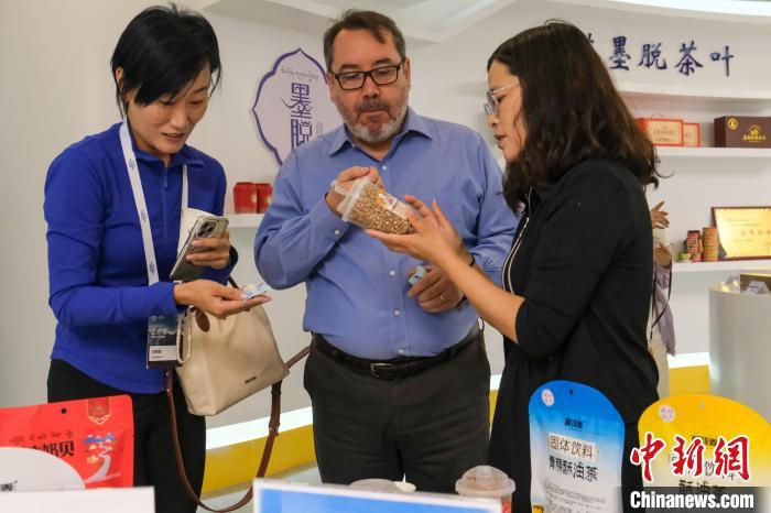 圖為6月28日,智利駐華大使巴勃羅·阿里亞蘭(中)在林芝經(jīng)濟(jì)開發(fā)區(qū)參訪時(shí)品嘗青稞食品。中新社記者 江飛波 攝