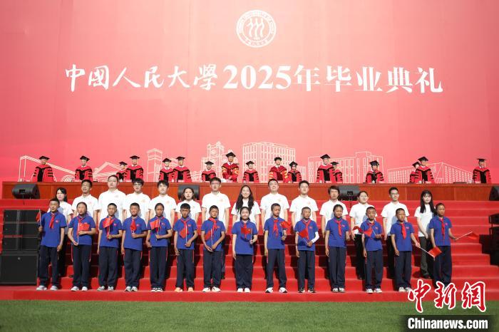 6月23日,中國人民大學(xué)2025年畢業(yè)典禮現(xiàn)場,措果鄉(xiāng)中心小學(xué)的孩子們與人大畢業(yè)生們小手牽大手,相伴而立,共同唱響《萬疆》。主辦方供圖
