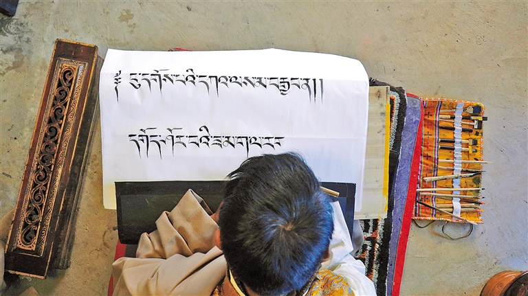 索朗多布杰正在認(rèn)真創(chuàng)作書(shū)法作品。