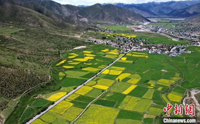 7月5日,西藏拉薩市墨竹工卡縣油菜花盛放。無(wú)人機(jī)航拍視角下,一塊塊金黃的油菜花田猶如大地的調(diào)色板,風(fēng)光宜人。(無(wú)人機(jī)照片)中新社記者 李林 攝