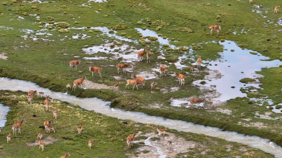近日,藏羚羊群中,一只罕見的白色小藏羚羊緊隨母親,踏過河水順利抵達對岸,雪白的身影在群中格外醒目。