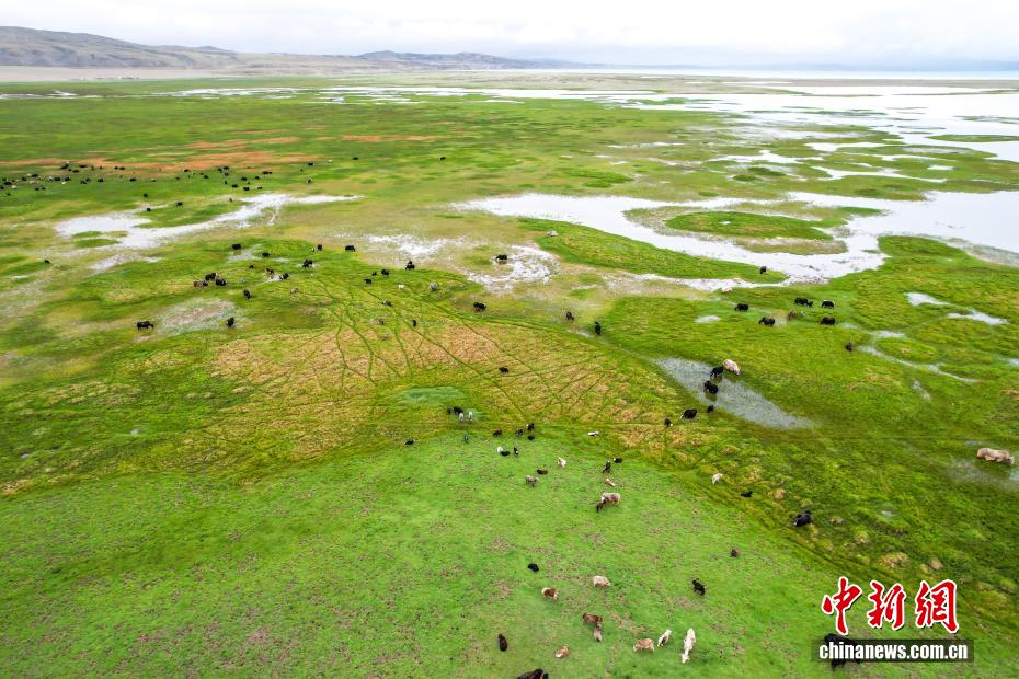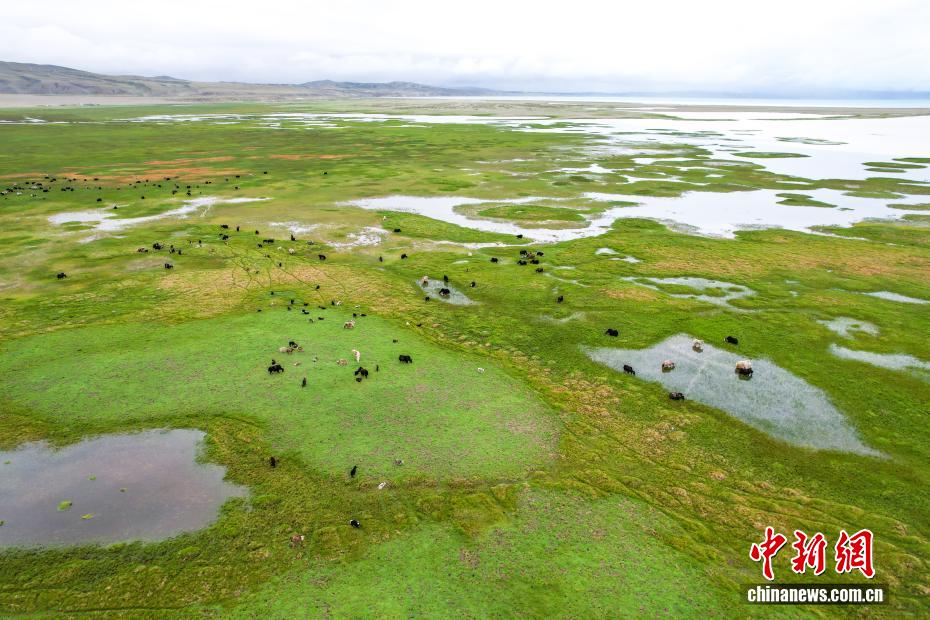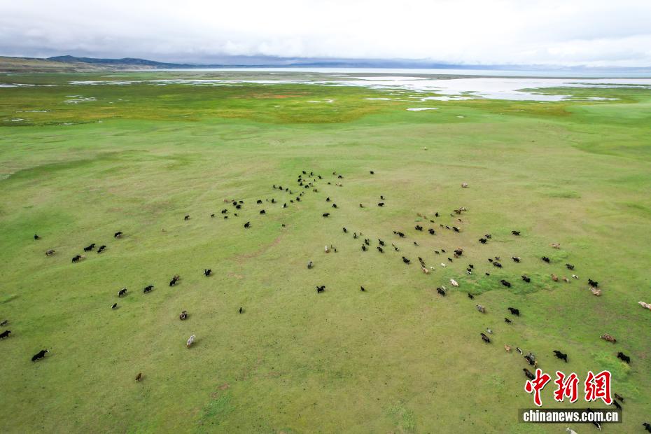 7月22日,在西藏阿里地區(qū)普蘭縣霍爾鄉(xiāng),牧民在瑪旁雍錯(cuò)濕地上放牧牦牛。為實(shí)現(xiàn)更大的經(jīng)濟(jì)效益,霍爾鄉(xiāng)近年來探索建立牦牛養(yǎng)殖專業(yè)合作社,按當(dāng)?shù)刈匀粭l件合理分配牦牛放牧地點(diǎn),并將牛奶進(jìn)行加工銷售,2023年該合作社的年總收入達(dá)到60余萬元人民幣,帶動(dòng)牧民人均增收2萬余元人民幣。(無人機(jī)照片)中新社記者 張祥毅 攝
