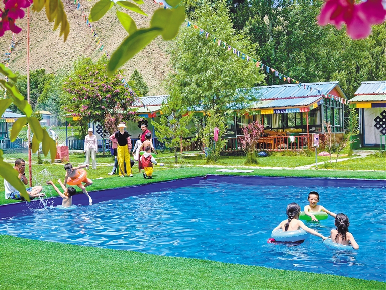 群眾在拉薩市林周縣白定村的林卡營地內(nèi)玩水嬉戲。記者 洛桑 攝