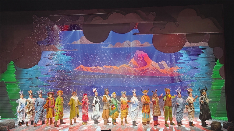 在《高原上的精靈》舞臺(tái)上,西藏傳統(tǒng)樂(lè)器的韻律與生態(tài)寓言相互交織。當(dāng)弦子、鷹笛和扎念琴的聲音劃破夜空時(shí),小觀眾們已沉浸其中。藏戲溫巴的藍(lán)面具在聚光燈下浮現(xiàn),藏戲特有的說(shuō)唱調(diào)式如雪山融水般流淌……《高原上的精靈》以80分鐘的音樂(lè)劇形式突破傳統(tǒng)話劇的敘事框架,這種形式選擇源于深刻的兒童心理洞察——音樂(lè)劇特有的歌舞敘事能持續(xù)刺激視覺(jué)與聽(tīng)覺(jué)神經(jīng),避免低齡觀眾對(duì)純對(duì)白場(chǎng)景產(chǎn)生倦怠感。