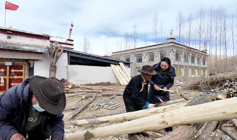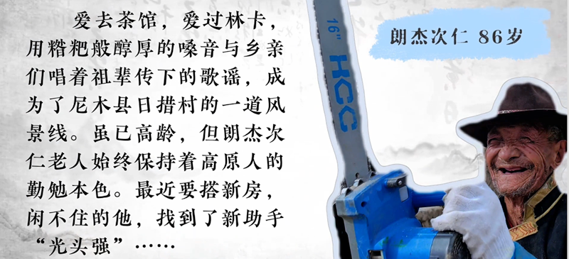 雖已86歲高齡,但朗杰次仁老人始終保持著高原人的勤勉本色。最近老人要搭建新房,我們來時,他正和新助手“光頭強”(電鋸)一起在小院里忙活。