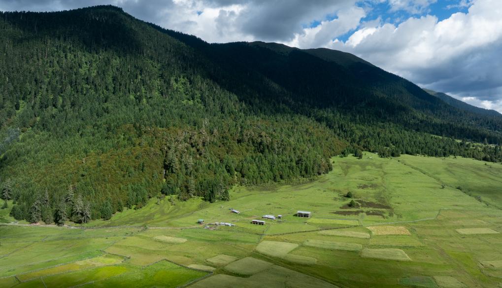 俯瞰扎西崗村旁的花海牧場(無人機照片)。新華社記者 丁增尼達 攝