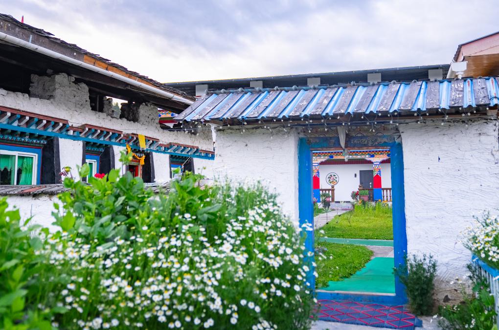 旦增家的藏式民宿門前種滿了鮮花。新華社記者 丁增尼達 攝