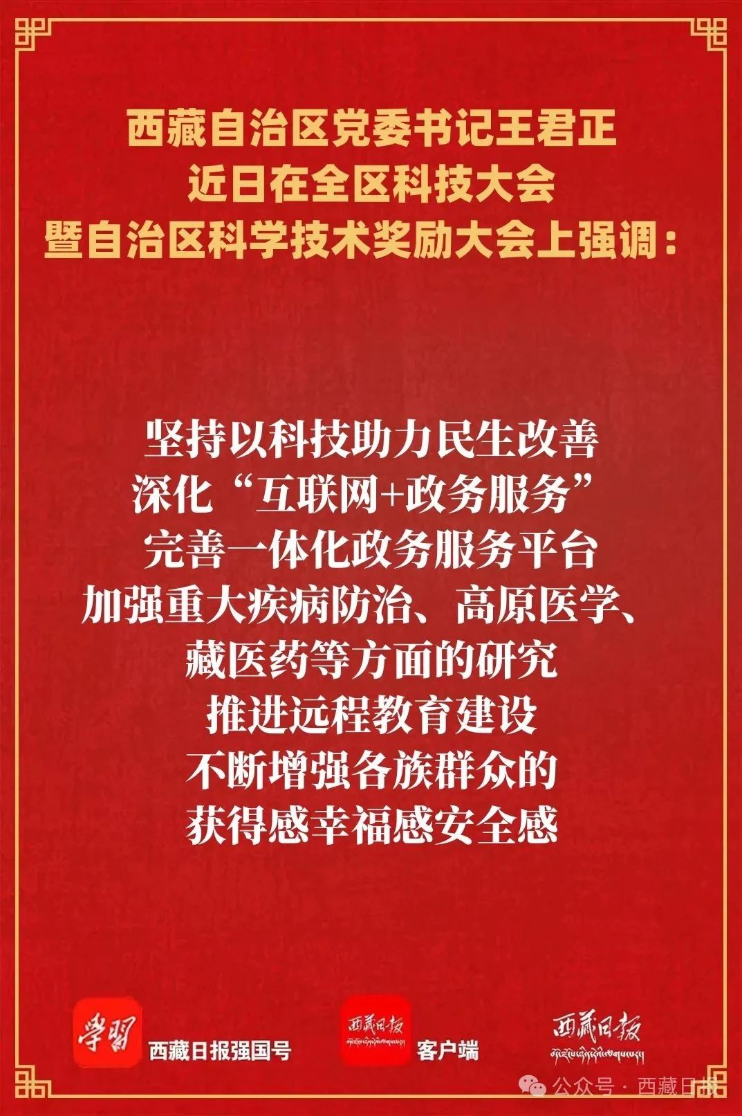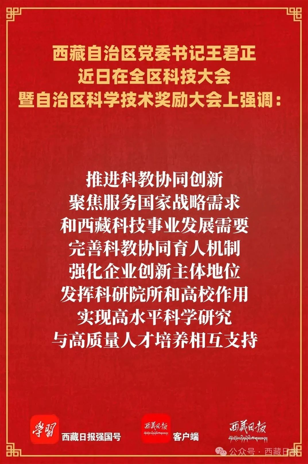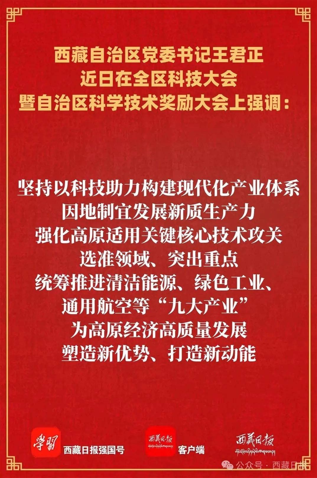 近日,全區(qū)科技大會暨自治區(qū)科學(xué)技術(shù)獎(jiǎng)勵(lì)大會在拉薩召開,自治區(qū)黨委書記王君正出席并講話。他強(qiáng)調(diào),要深入貫徹落實(shí)習(xí)近平總書記關(guān)于科技創(chuàng)新、西藏工作的重要指示和新時(shí)代黨的治藏方略,加快推動(dòng)科技事業(yè)發(fā)展,為社會主義現(xiàn)代化新西藏建設(shè)提供堅(jiān)實(shí)科技支撐。