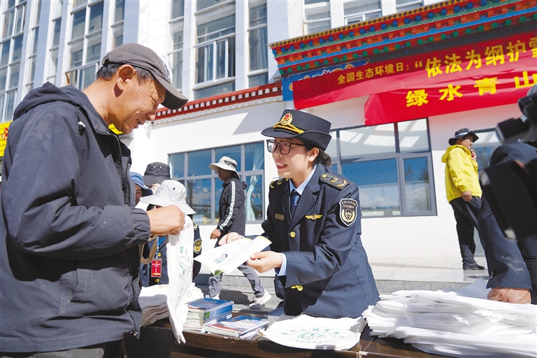 在法規(guī)宣講環(huán)節(jié),工作人員通過設(shè)立宣傳展板、懸掛宣傳橫幅、發(fā)放政策法規(guī)手冊(cè)、現(xiàn)場(chǎng)接受群眾咨詢答疑等形式,向群眾集中宣傳《中華人民共和國青藏高原生態(tài)保護(hù)法》及自治區(qū)實(shí)施辦法等生態(tài)環(huán)保法律法規(guī)。