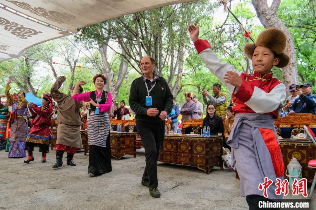 2023年5月19日,柯馬凱在拉薩羅布林卡聽藏戲,和當?shù)夭刈迕癖娨坏捞伹f舞。中新社記者 江飛波 攝