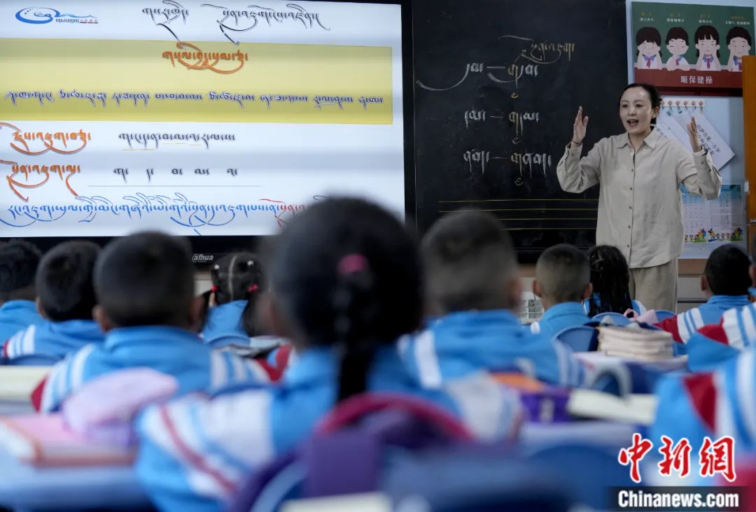 2025年3月10日,拉薩市第一小學藏語文老師桑旦旺姆使用科技設(shè)備在課堂上講授藏語。中新社記者 李林 攝