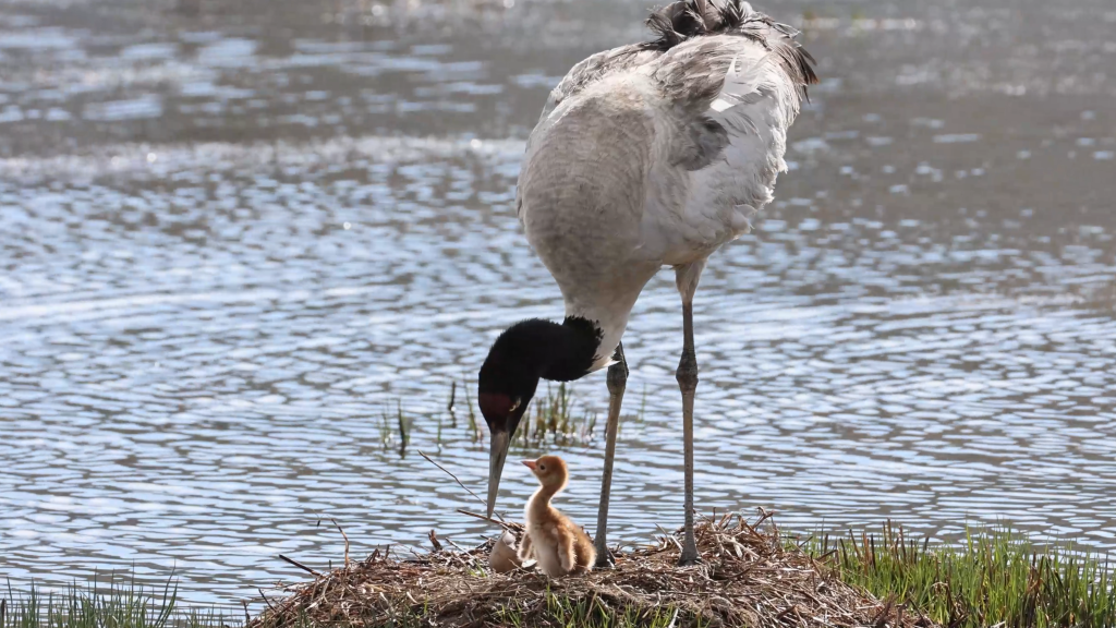 說到這里,次成塔青突然轉(zhuǎn)過身,看向高高麗麗和它們的孩子。開始下雨了,水面上鋪滿了細(xì)密的漣漪,而在濕地中央那一個(gè)不大的巢上,是一動(dòng)不動(dòng)、用身子緊緊護(hù)住孩子的黑頸鶴。看著這一幕,風(fēng)雨似乎也沒有那么刺骨了……