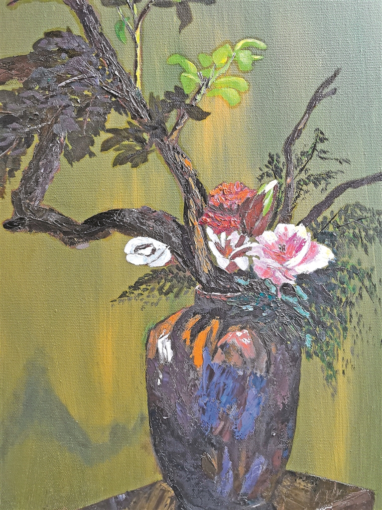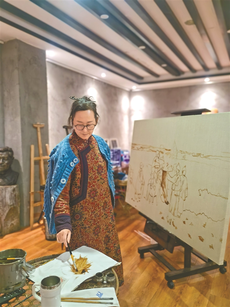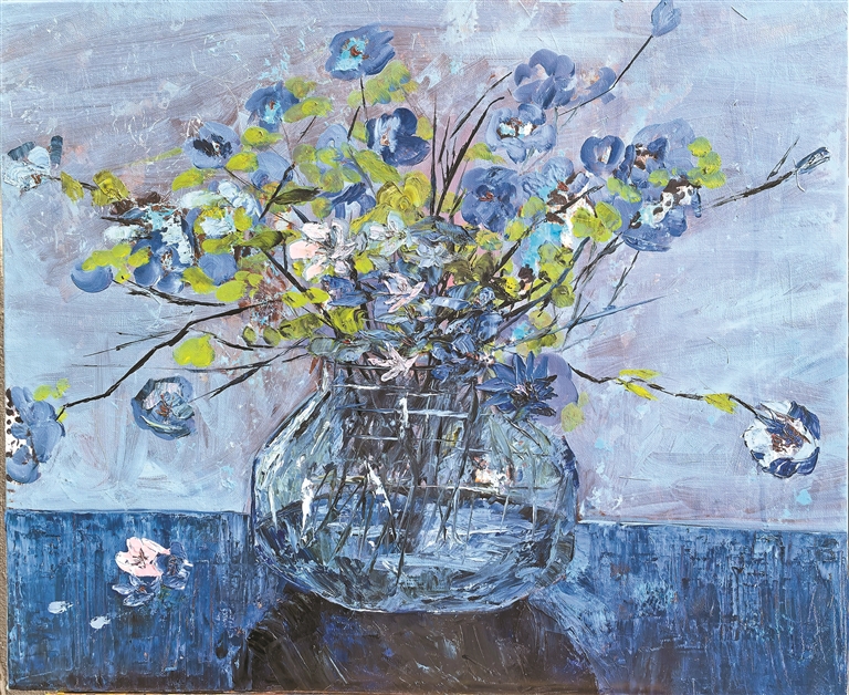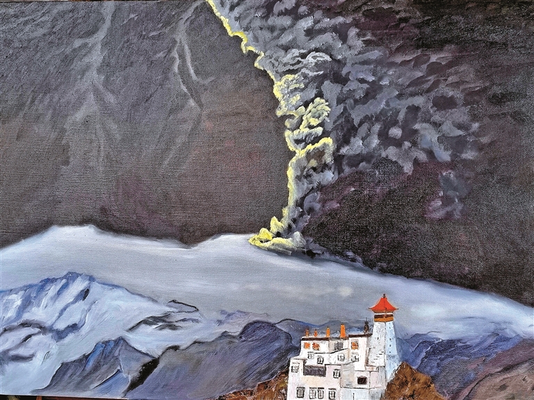 推開羽芊位于拉薩東郊的家門,目光首先被三面通體書墻溫柔捕獲。文學、歷史、自然、科學,上萬冊藏書如沉默的智者靜立。書柜一角,整齊擺放著《藏婚》《西藏生死戀》《金城公主》等十五部藏地題材作品,每一本都浸潤著高原陽光的暖意。四處打量,書桌旁立著一個畫架,未完成的油畫上,藏北草原斑斕秋色正流淌在畫布上,透露出她對光影與色彩天生的敏銳——這份未被刻意強調的油畫天賦,悄然浸染著她的文學世界。