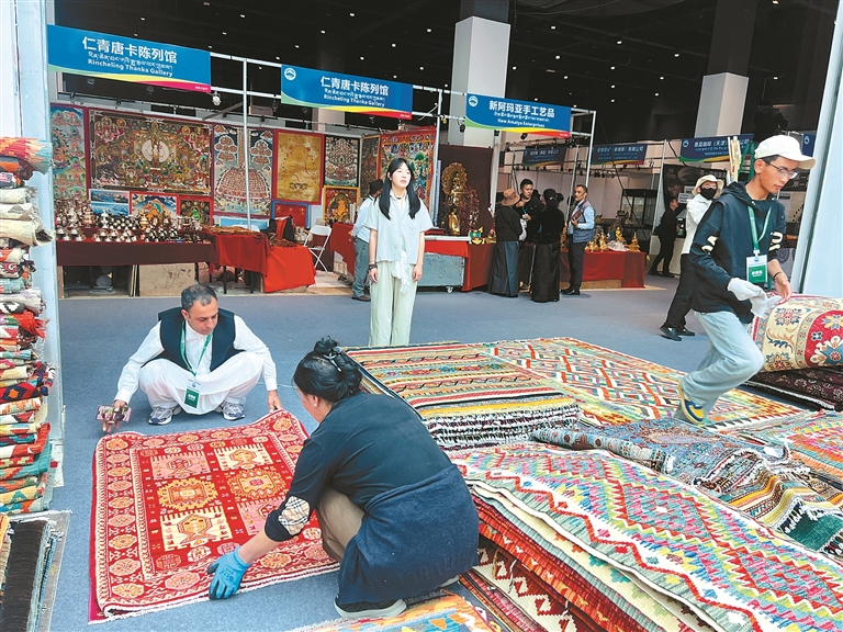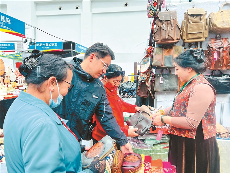 西藏本土特色產(chǎn)品同樣是展會的亮點。在非遺展區(qū),藝人們正向游客傳授唐卡選購技巧;藏式食品銷售區(qū)更為熱鬧,工作人員為游客遞上酥油茶:“趁熱喝,配青稞餅更地道!”不少游客端碗坐在藏式卡墊上,一邊品嘗一邊交流,手中還拿著剛購買的唐卡圖案布袋,神情喜悅。