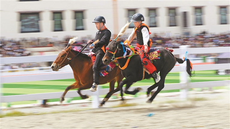 “達瑪”藏語意為“跑馬射箭”。每年的達瑪節(jié),賽馬都會吸引十里八鄉(xiāng)的人們前來觀賽。賽馬場上人頭攢動,隨著發(fā)令聲響,一匹匹駿馬如離弦之箭沖出起跑線,騎手俯身貼在馬背上,揚鞭馳騁,你追我趕,奮勇爭先。觀眾席上,人們隨著比賽節(jié)奏,時而激動,時而安靜,時而歡呼,時而嘆息。藏族阿媽次仁卓嘎難掩激動,她告訴記者,幾乎每年都會和家人來看賽馬。賽場上,選手們堅韌不拔、昂揚向上的精神風貌讓人動容,也激勵著一代又一代英雄城兒女為祖國發(fā)展繁榮而不懈奮斗。