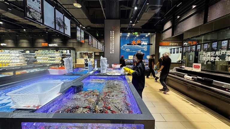 肉禽區(qū)在保留原有優(yōu)質(zhì)商品基礎(chǔ)上,新增黑豬系列冷鮮肉、品牌冷鮮進口牛肉、原切牛排等高品質(zhì)商品,同時引入藏香豬冷鮮肉、牦牛肉、本地藏雞蛋等特色商品。海鮮區(qū)域在保留本地淡水魚的基礎(chǔ)上,加大明蝦、鮑魚、扇貝等大海鮮的占比,同時帝王蟹、波龍、面包蟹、珍寶蟹組成“進口四大金剛”,滿足顧客對高端海鮮的需求。針對季節(jié)需求,還推出優(yōu)質(zhì)大閘蟹等時令商品,滿足消費者對優(yōu)質(zhì)蛋白的需求。
